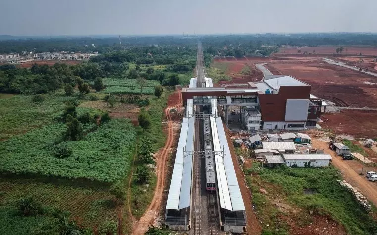 Foto udara rangkaian kereta rel listrik (KRL) Commuterline melintas di samping proyek pembangunan Stasiun Jatake, Pagedangan, Kabupaten Tangerang, Banten, Rabu (16/7/2025). ANTARA FOTO/Putra M Akbar/foc.