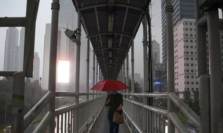 Ilustrasi - Seorang warga membawa payung saat melintas di jembatan penyeberangan orang (JPO) di Jalan Jenderal Sudirman, Jakarta, Jumat (16/10/2020). ANTARA FOTO/Wahyu Putro A/wsj/pri.