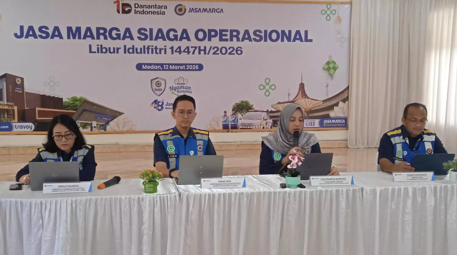 Jasamarga Nusantara Tollroad Regional Division (JNT/Regional Nusantara) menggelar konferensi pers kesiapan operasional Ruas Tol Belawan-Medan-Tanjung Morawa (Belmera) dan Ruas Tol Medan-Kualanamu-Tebing Tinggi (MKTT) serta Apel Siaga Operasional jelang periode arus mudik dan balik Idulfitri 1447 H/2026 di kantor Representative Office 1 Jasamarga Nusantara Tollroad (RO1JNT) di Medan, Kamis, (12/3).