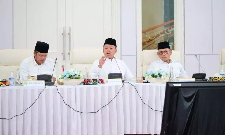 Menteri ATR/BPN Nusron Wahid diaprit Gubernur Kaltim Rudy Mas'ud dan Wagub Seno Aji saat memimpin Rapat Koordinasi Daerah Pertanahan dan Tata Ruang Se-Kalimantan Timur di Samarinda, Jumat (24/10/2025). ANTARA/HO-Dok BPN Kaltim.