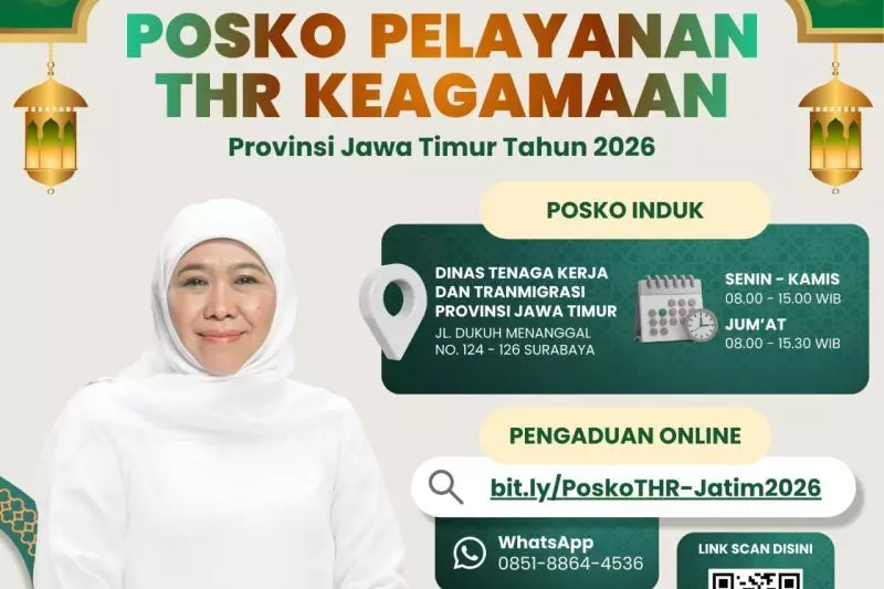 "Posko THR Keagamaan Jawa Timur Tahun 2026 melayani aduan masyarakat khususnya para buruh dan pekerja mulai tanggal 26 Februari sampai dengan 17 Maret 2026 pada hari kerja," kata Gubernur Jatim Khofifah Indar Parawansa di Surabaya, Jumat.
