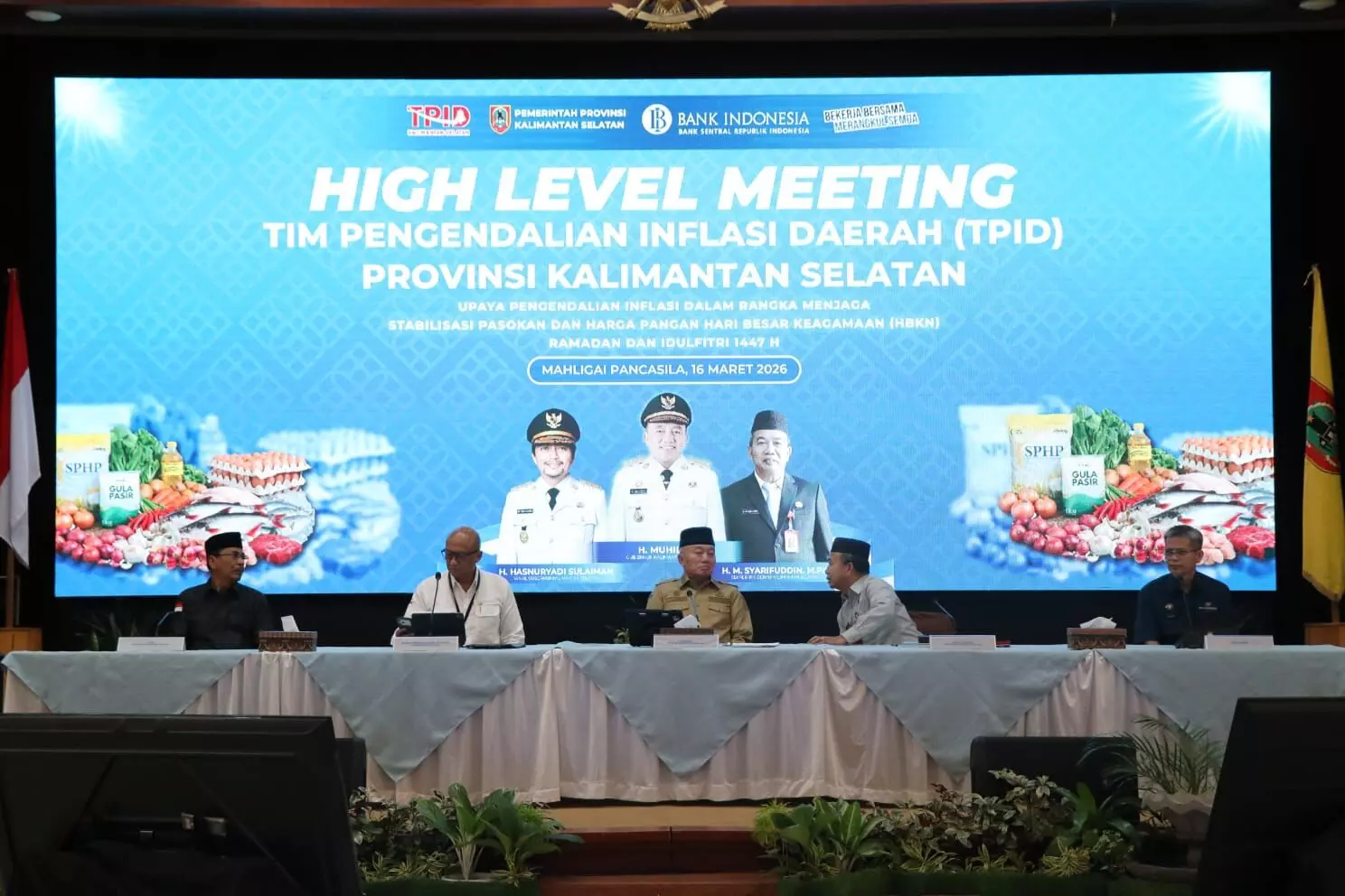 Upaya tersebut dilakukan melalui High Level Meeting (HLM) TPID Provinsi Kalimantan Selatan yang diselenggarakan di Gedung Mahligai Pancasila, Banjarmasin, pada Senin (16/3/2026). Pertemuan tersebut dipimpin oleh Gubernur Kalimantan Selatan, H. Muhidin, bersama Kepala Perwakilan Bank Indonesia Provinsi Kalimantan Selatan dan dihadiri oleh jajaran Forkopimda Kalimantan Selatan, Badan Pusat Statistik (BPS), Instansi Vertikal, BUMN, Perumda, serta SKPD yang tergabung dalam anggota TPID provinsi Kalimantan Selatan.