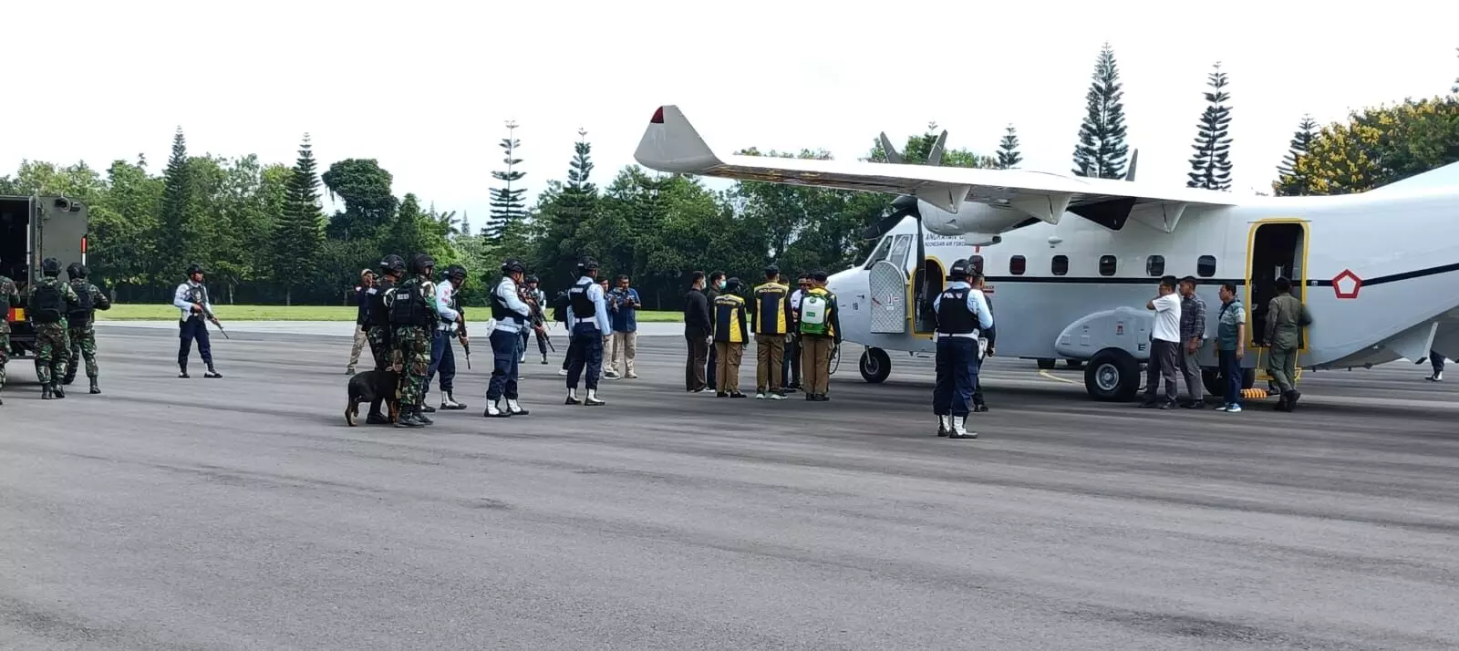 Usai mendarat dilakukan sejumlah pemeriksaan dengan penjagaan super ketat yang dilakukan dengan melibatkan tim pengamanan lanud hingga Jihandak Zeni TNI-AD.