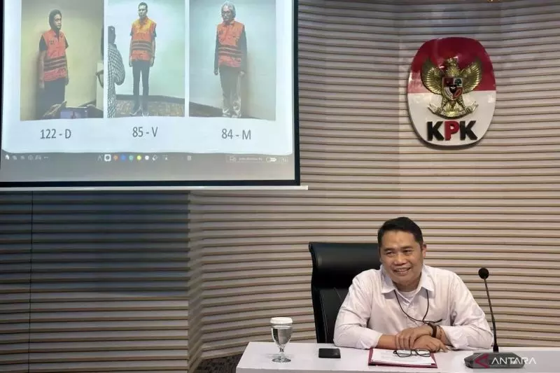 Plt. Deputi Penindakan dan Eksekusi KPK RI Asep Guntur Rahayu memperlihatkan foto ketiga tersangka kasus dugaan korupsi terkait pengajuan restitusi pajak pada lingkungan Kantor Pelayanan Pajak Madya Banjarmasin Provinsi Kalimantan Selatan (Kalsel) di Gedung Merah Putih KPK, Jakarta, Kamis (5/2/2026). ANTARA/Rio Feisal.