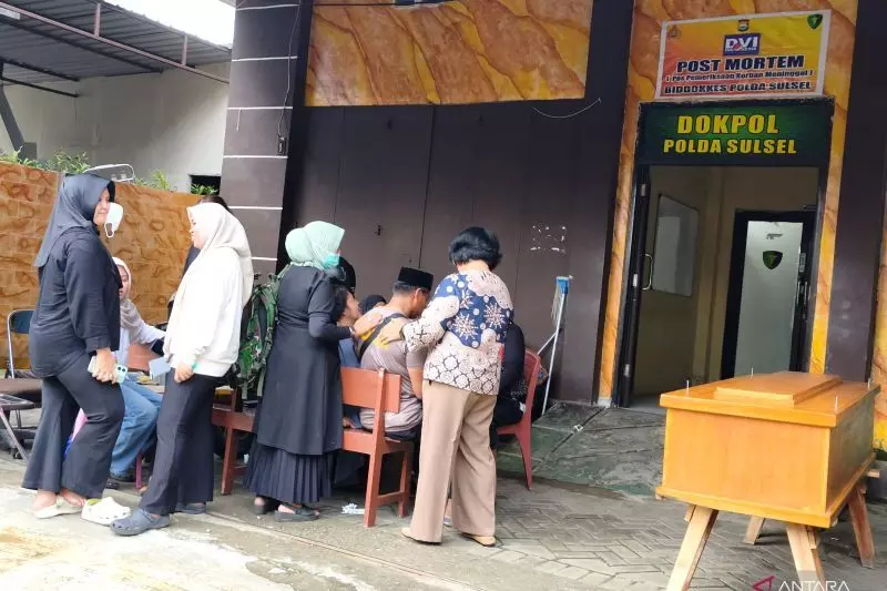 Sejumlah keluarga korban anggota Polri inisial Bripda DP yang diduga mengalami kekerasan oleh seniornya hingga meninggal dunia masih menunggu hasil pemeriksaan di area Biddokkes Rumah Sakit Bayangkara Makassar, Sulawesi Selatan, Minggu (22/2/2026). ANTARA/Darwin Fatir.