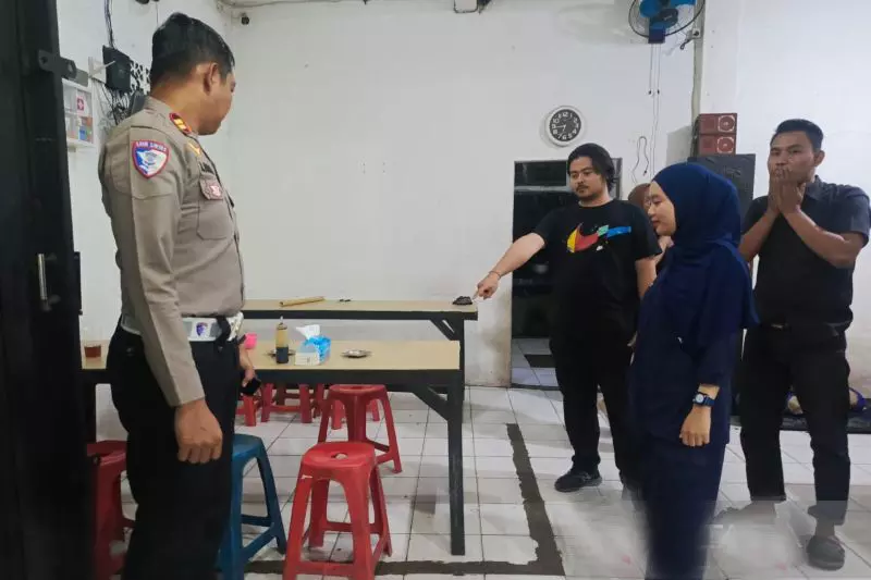 Polisi melakukan olah tempat kejadian perkara penipuan di sebuah rumah makan, depan Klinik Mitra Sehat Jarakosta, Desa Danau Indah, Kecamatan Cikarang Barat, Kabupaten Bekasi.ANTARA/Pradita Kurniawan Syah.