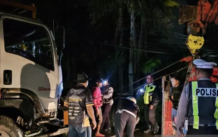 Arsip Foto : Petugas dari Dinas Perhubungan (Dishub) Kota Batu memasang pengait sling baja untuk mengevakuasi truk yang mengalami tabrakan beruntun di Jalan Pattimura, Kota Batu, Jawa Timur, Rabu (18/2/2026). ANTARA/Ananto Pradana.