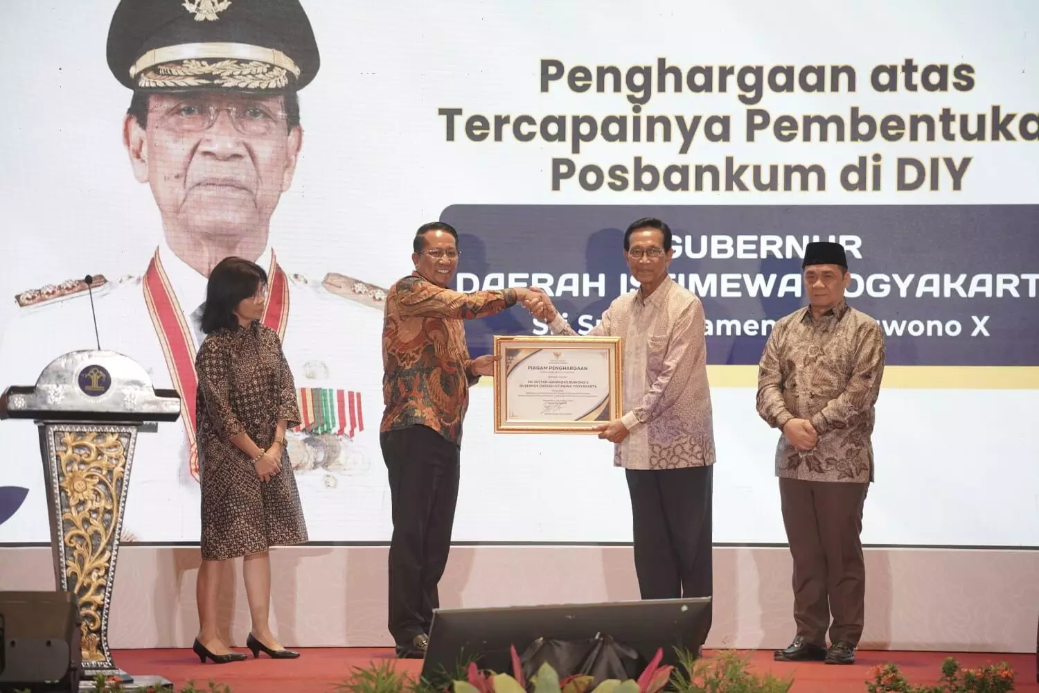 Pembentukan pos bantuan hukum (Posbankum) di Daerah Istimewa Yogyakarta (DIY) telah tercapai 100 %. Atas kesuskesan capaian 100 persen pembentukan pos bantuan hukum di DIY tersebut Gubernur DIY Sri Sultan Hamengku Buwono X mendapat piagam penghargaan dari Menteri Hukum RI pada peresmian 438 Posbankum Kalurahan/Kelurahan di DIY di Royal Ambarrukmo Hotel, Selasa (20/1).