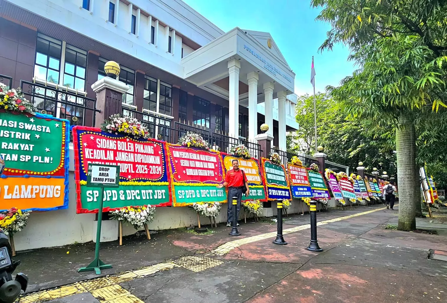 Sejak pagi hari, suasana PTUN Jakarta tampak berbeda. Terpantau sejak pukul 07.00 WIB, puluhan karangan bunga berbaris rapi memenuhi halaman depan PTUN Jakarta, bahkan meluber hingga ke luar area gedung dan sisi jalan.