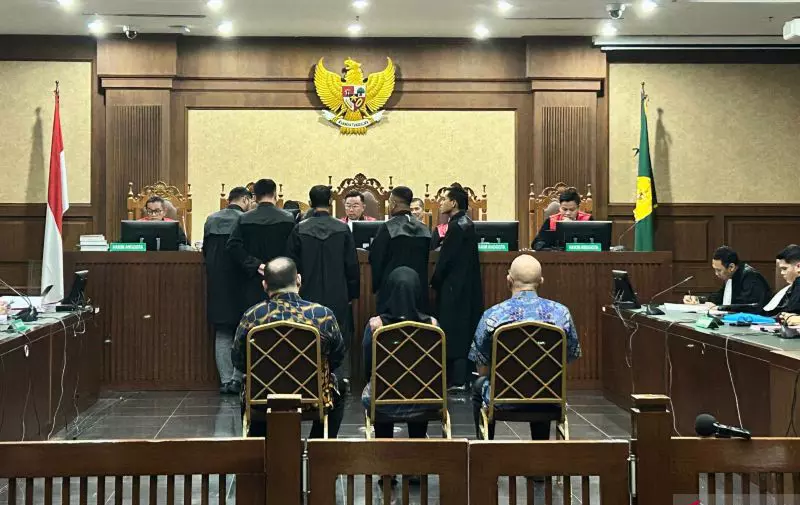 Sebanyak tiga terdakwa kasus dugaan korupsi dalam program digitalisasi pendidikan di lingkungan Kemendikbudristek pada tahun 2019-2022, dalam sidang pembacaan surat dakwaan di Pengadilan Tipikor pada PN Jakarta Pusat, Selasa (16/12/2025). ANTARA/Agatha Olivia Victoria.