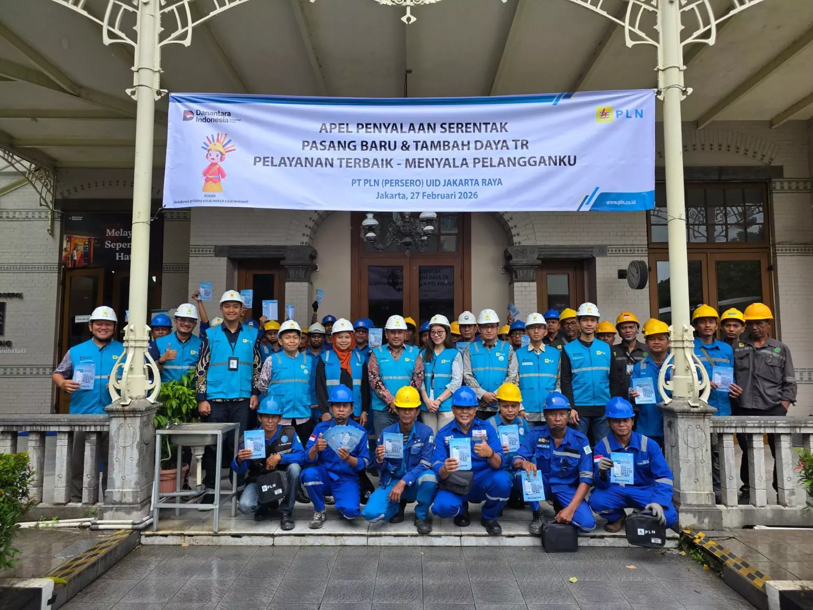 Jajaran manajemen PLN UID Jakarta Raya dan petugas mengikuti Apel Penyalaan Serentak Pasang Baru dan Tambah Daya bagi 1.400 pelanggan di Kantor PLN UP3 Menteng, Jakarta, Jumat (27/2/2026)