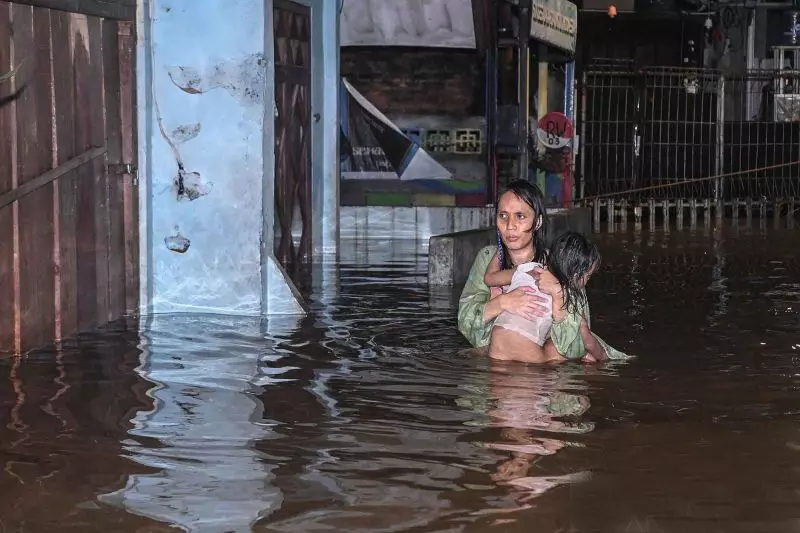 Warga menggendong anaknya saat menerobos banjir di kawasan Petogoan, Kebayoran Baru, Jakarta, Kamis (30/10/2025). ANTARA FOTO/Sulthony Hasanuddin/nym.