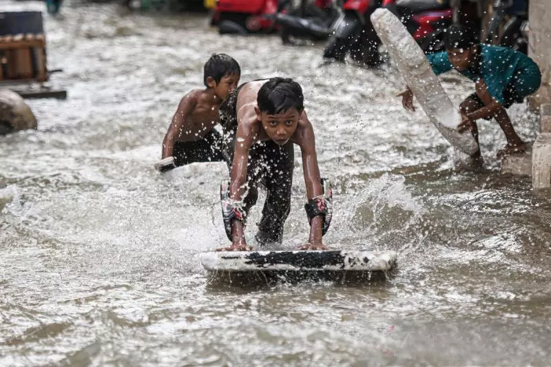 Ilustrasi - Anak-anak bermain saat banjir rob di Muara Angke, Jakarta, Jumat (7/11/2025). ANTARA FOTO/Sulthony Hasanuddin/tom.