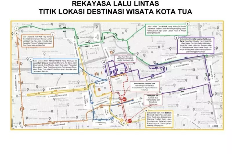Selanjutnya, lalu lintas dari arah timur/utara yang menuju ke Asemka/Harmoni diarahkan menerus ke arah barat Jalan Kunir menjadi dua arah melalui Jalan Kopi-Jalan Pejagalan Raya-Jalan Pasar Pagi Lama-Jalan Perniagaan Raya- Jalan Toko Tiga-Jalan Pintu Kecil-Jalan Asemka-Jalan Jembatan Batu.