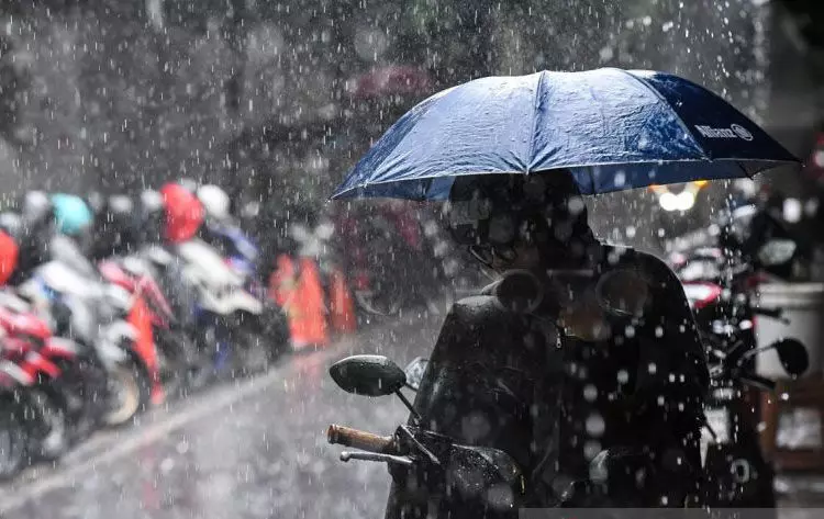 Pengendara sepeda motor menggunakan payung saat hujan di kawasan Senopati, Jakarta, Jumat (14/3/2025).
