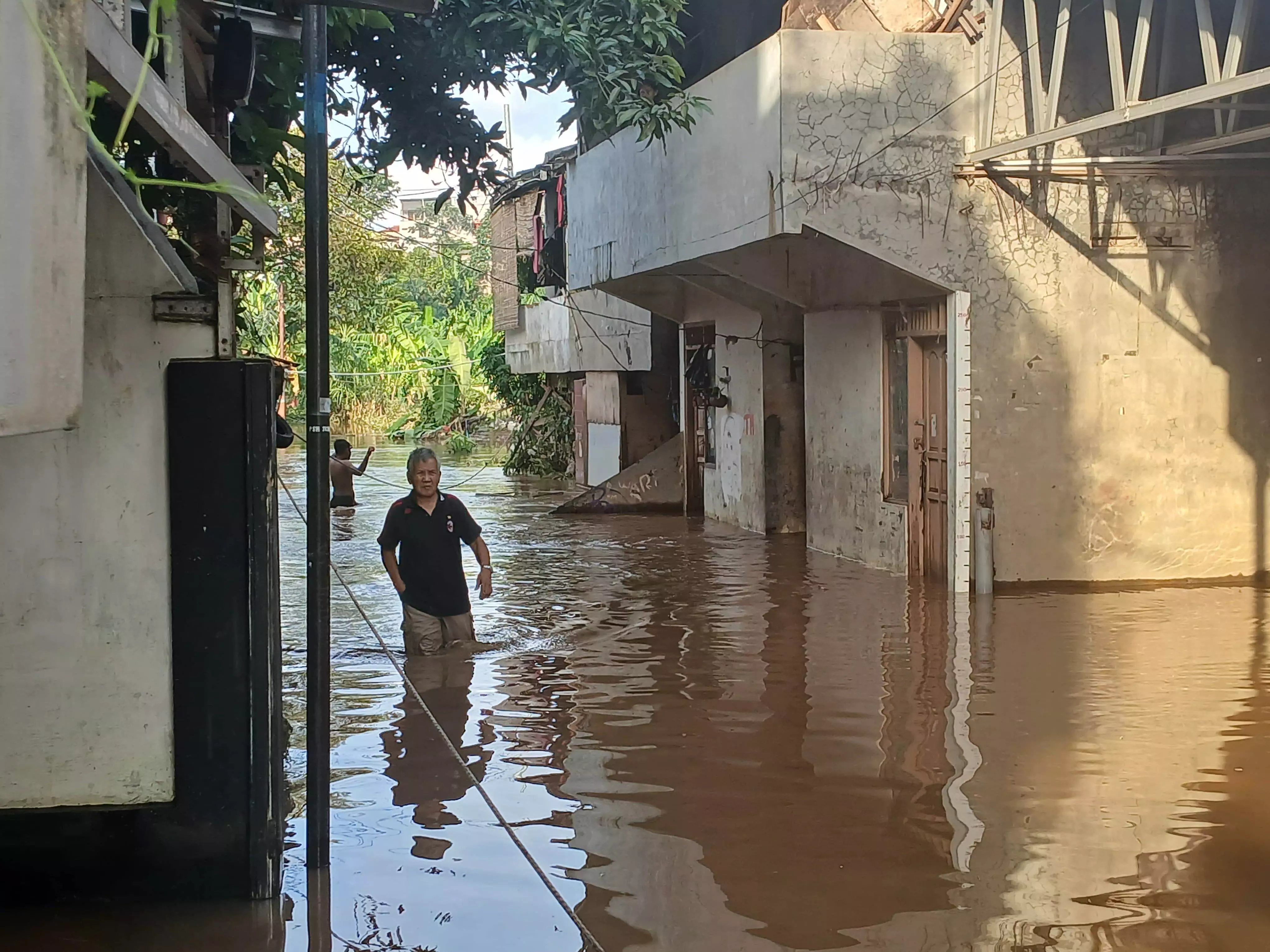 Banjir yang disebabkan luapan air dari Kali Ciliwung membuat warga Pejaten Timur RT 05 RW 08 dan RT 17 RW 07, Jakarta Selatan, terendam banjir hingga 130 cm