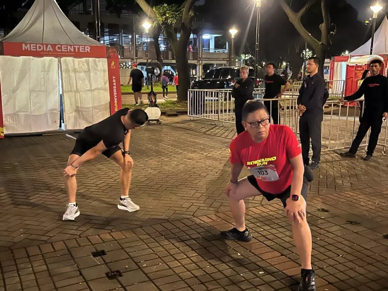 Sekretaris Jenderal PDI Perjuangan (PDIP), Hasto Kristiyanto, mengikuti sesi pemanasan menjelang pelaksanaan Soekarno Run 2026 di kawasan Parkir Timur Senayan, Gelora Bung Karno, Jakarta. Hasto, yang dijadwalkan menempuh rute lari sejauh 10 kilometer, tampak mengenakan jersei berwarna merah khas ajang tersebut.