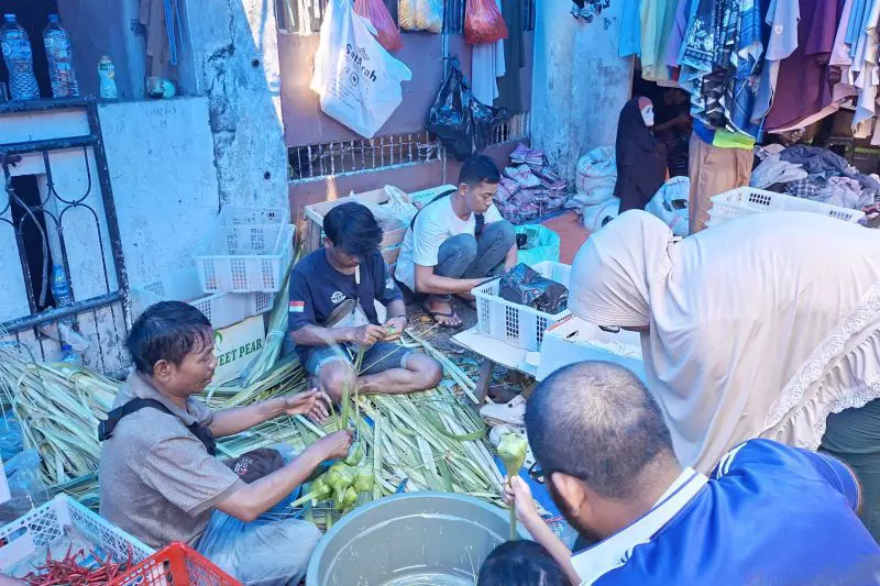 Aktivitas jual beli di Pasar Jatinegara kian meningkat dan dipadati warga yang berburu kulit ketupat menjelang Hari Raya Idul Fitri 1447 Hijriah atau Lebaran 2026.