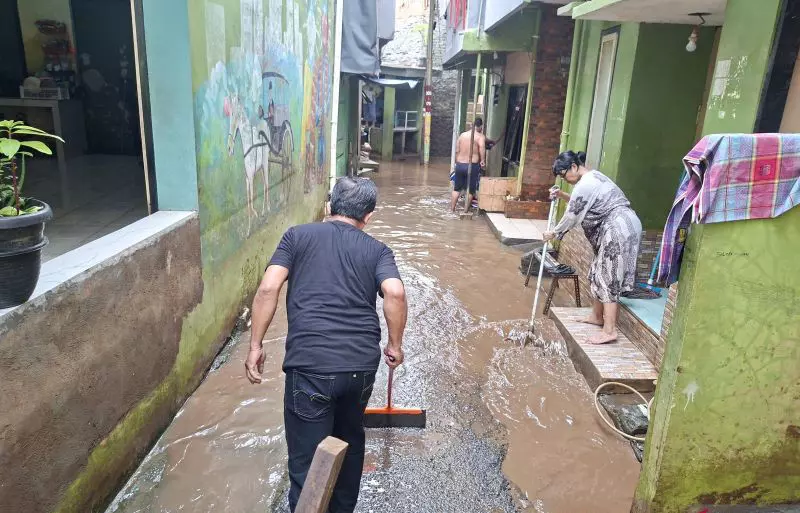 Sejumlah warga tampak menyiram lantai, mengeruk lumpur, serta mengevakuasi barang-barang yang terdampak banjir.