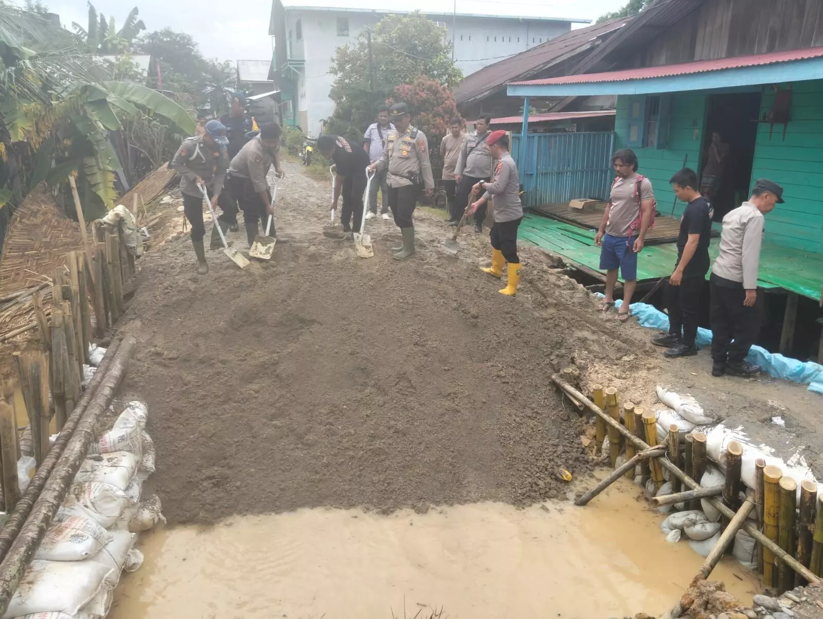 Polsek Tanjung Pura, Polres Langkat, Polda Sumatera Utara bersama Pasmob I Binjai dan warga sekitar melaksanakan perbaikan tanggul yang mengalami kerusakan di jalan Sebarau, Lingkungan IX, Kelurahan Pekan Tanjung Pura, Kecamatan Tanjung Pura, Kabupaten Langkat, Selasa (9/12).