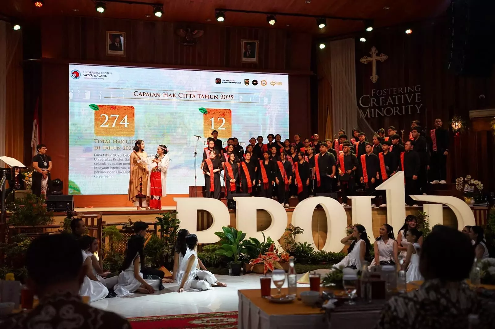 Peringatan Dies Natalis ke 69 Universitas Kristen Satya Wacana (UKSW) Salatiga, Jawa Tengah dalam Rapat Terbuka Senat Universitas mengangkat tema “Tetaplah Berakar, Bertumbuh, dan Berbuah” dengan menghadirkan rangkaian prosesi liturgis dan ekspresi seni sebagai refleksi atas perjalanan intelektual dan spiritual UKSW berlangsung semarak, Senin (1/12/2025) di Balairung Universitas.