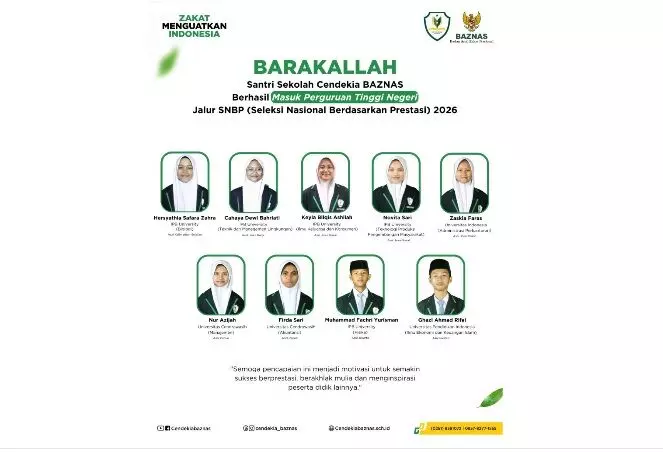 Badan Amil Zakat Nasional (BAZNAS) RI melalui Sekolah Cendekia BAZNAS (SCB) kembali membuktikan kualitasnya. Sebanyak sembilan santri SCB dinyatakan lolos ke Perguruan Tinggi Negeri (PTN) melalui Seleksi Nasional Berdasarkan Prestasi (SNBP) 2026.