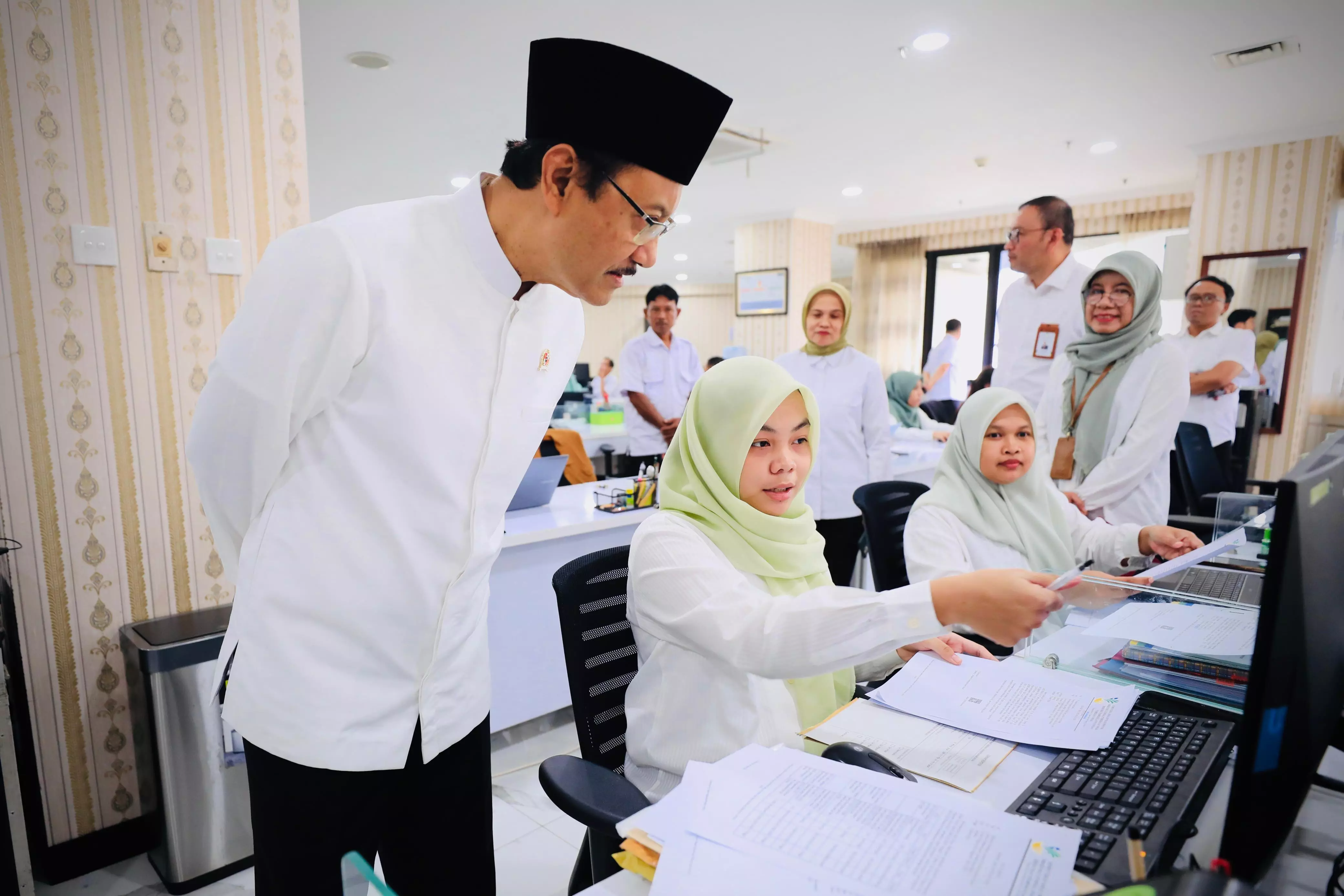 Menteri Sosial Saifullah Yusuf melakukan inspeksi mendadak (sidak) pada hari pertama masuk kerja usai cuti bersama Hari Raya Idulfitri, Rabu (25/3/2026). Dalam sidak tersebut, ia berkeliling kantor Kementerian Sosial sekaligus menyapa dan bersilaturahmi dengan para pegawai yang telah kembali bekerja.