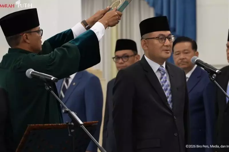 Tangkapan layar - Andi Rahadian membacakan sumpah jabatan dalam acara pelantikan dirinya sebagai Duta Besar Luar Biasa dan Berkuasa Penuh (LBBP) Republik Indonesia untuk Kesultanan Oman merangkap Republik Yaman di Istana Negara, Jakarta, Jumat (10/4/2026). (ANTARA/Youtube Sekretariat Presiden)