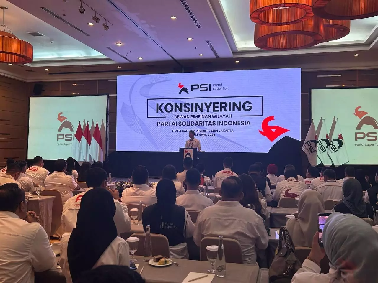 Partai Super Tbk (PSI) menggelar Konsiyering Dewan Perwakilan Wilayah (DPW) dan Dewan Perwakilan Daerah (DPD) se-Indonesia di Hotel Santika, Jakarta Barat, Minggu (12/4/2026). Kegiatan ini dihadiri langsung oleh Ketua Umum Kaesang Pangarep, Wakil Dewan Pembina Grace Natalie, serta Wakil Ketua Umum Isyana Bagoes Oka.