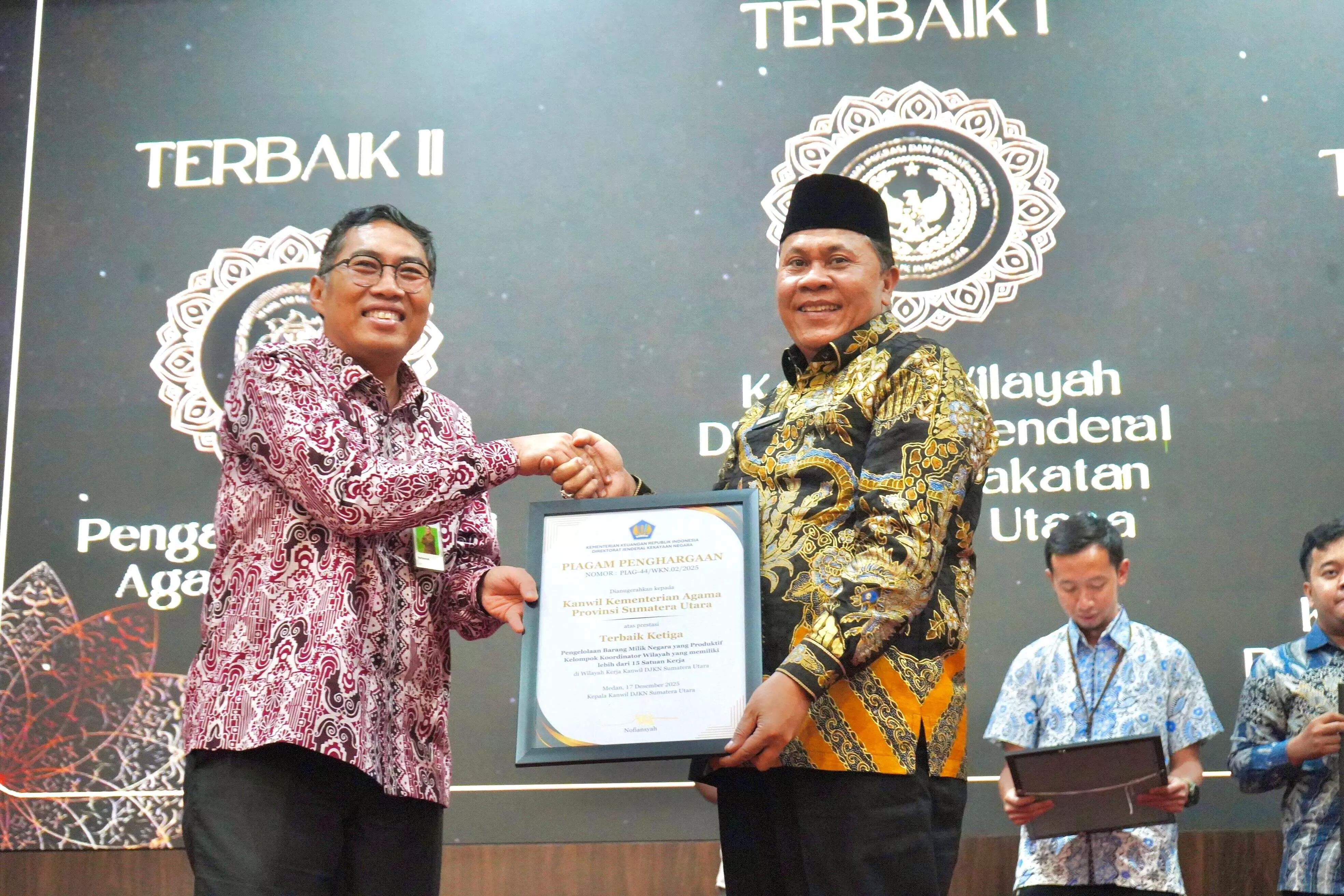 Kanwil Kemenag Sumut menjadi Terbaik III Pengelolaan Barang Milik Negara yang Produktif Kelompok Koordinator Wilayah yang memiliki lebih dari 15 Satuan Kerja di wilayah kerja DJKN Sumatera Utara.