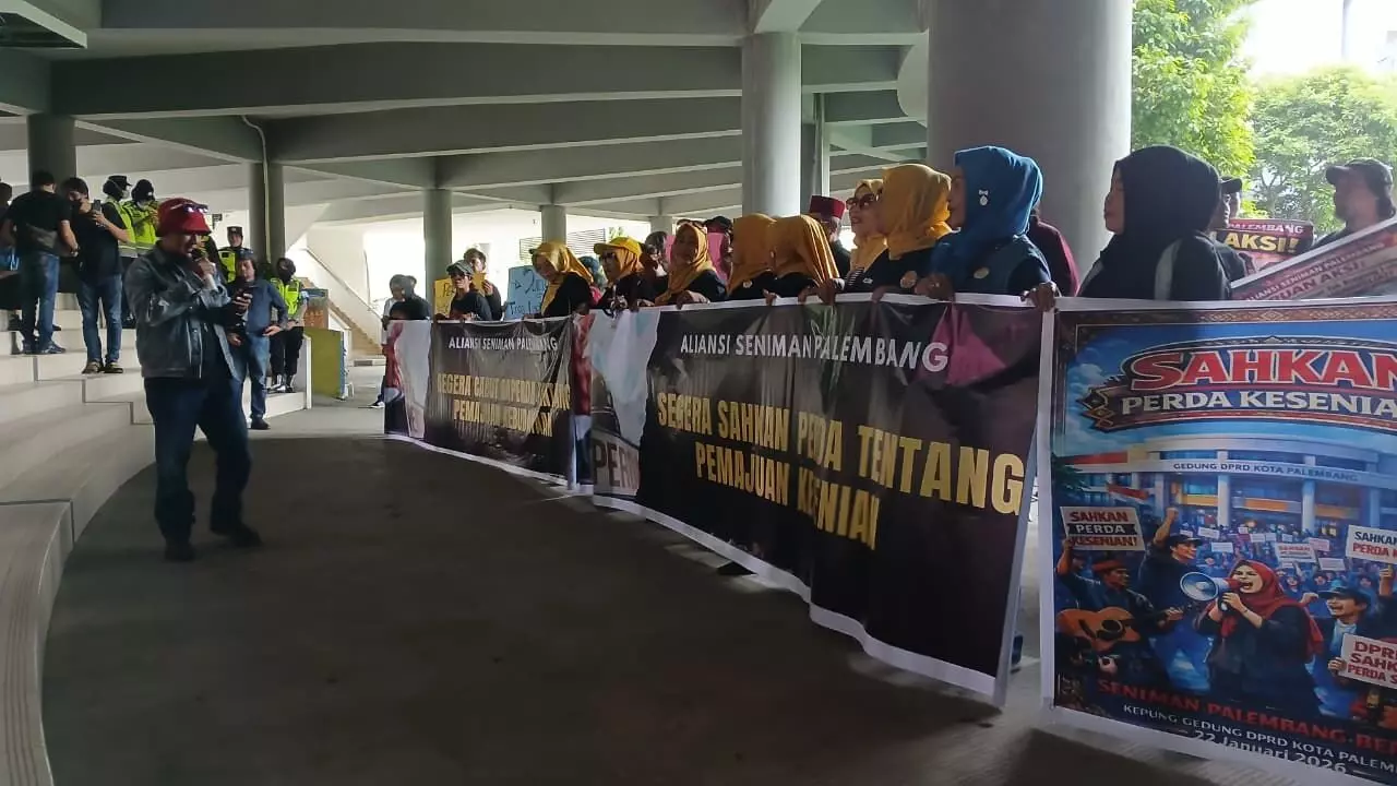 Ratusan seniman Palembang yang tergabung dalam berbagai elemen dan komunitas seni mendatangi Gedung DPRD Kota Palembang, Rabu (21/01/2026). Aksi dilakukan untuk mendesak DPRD Kota Palembang segera mengesahkan Peraturan Daerah (Perda) Kesenian yang hingga kini belum juga memiliki kepastian, meski telah diperjuangkan selama bertahun-tahun.