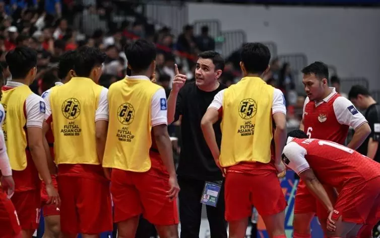 Pelatih Timnas futsal Indonesia Hector Souto Vazquez (tengah) memberikan arahan kepada timnas futsal Indonesia saat pertandingan melawan Iran pada final AFC Futsal Asian Cup 2026 di Indonesia Arena, Senayan, Jakarta, Sabtu (7/2/2026). ANTARA FOTO/Bayu Pratama S/fzn/agr