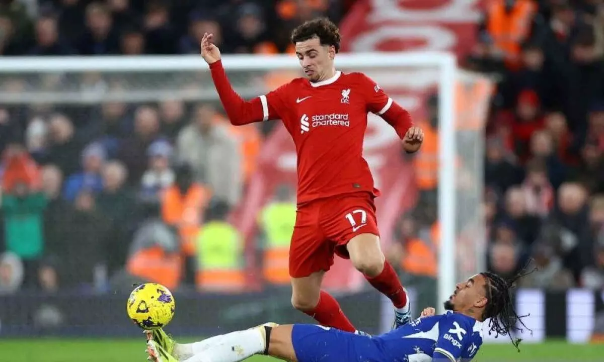 Pemain Liverpool Curtis Jones berebut bola dengan pemain Chelsea Malo Gusto dalam pertandingan lanjutan Liga Inggris di Anfield, Liverpool, Inggris, Kamis (1/2/2024). Liverpool berhasil memuncaki klasemen sementara setelah mengalahkan Chelsea dengan skor 4-1. ANTARA FOTO/Reuters/Carl Recine/nym.