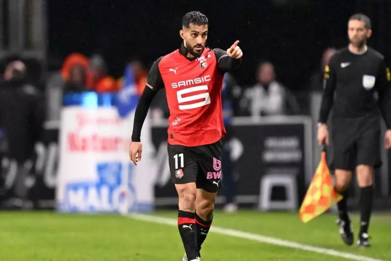 Penyerang sayap Rennes Musa Al Taamari merayakan keberhasilannya mencetak gol ke gawang PSG pada pertandingan Liga Prancis di Stadion Roazhon Park, Rennes, Jumat (13/2/2026) waktu setempat. (Ligue1.com)