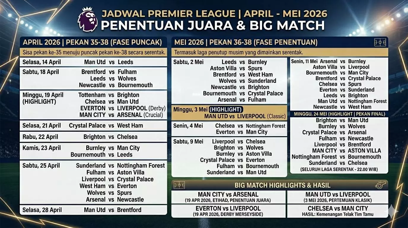 Dengan memahami jadwal Premier League April - Mei 2026 lengkap, penggemar dapat mengikuti setiap pertandingan penting yang menentukan klasemen akhir. Mulai dari persaingan gelar hingga perebutan tiket kompetisi Eropa, seluruh laga pada periode ini menjadi bagian krusial dari perjalanan musim liga inggris.