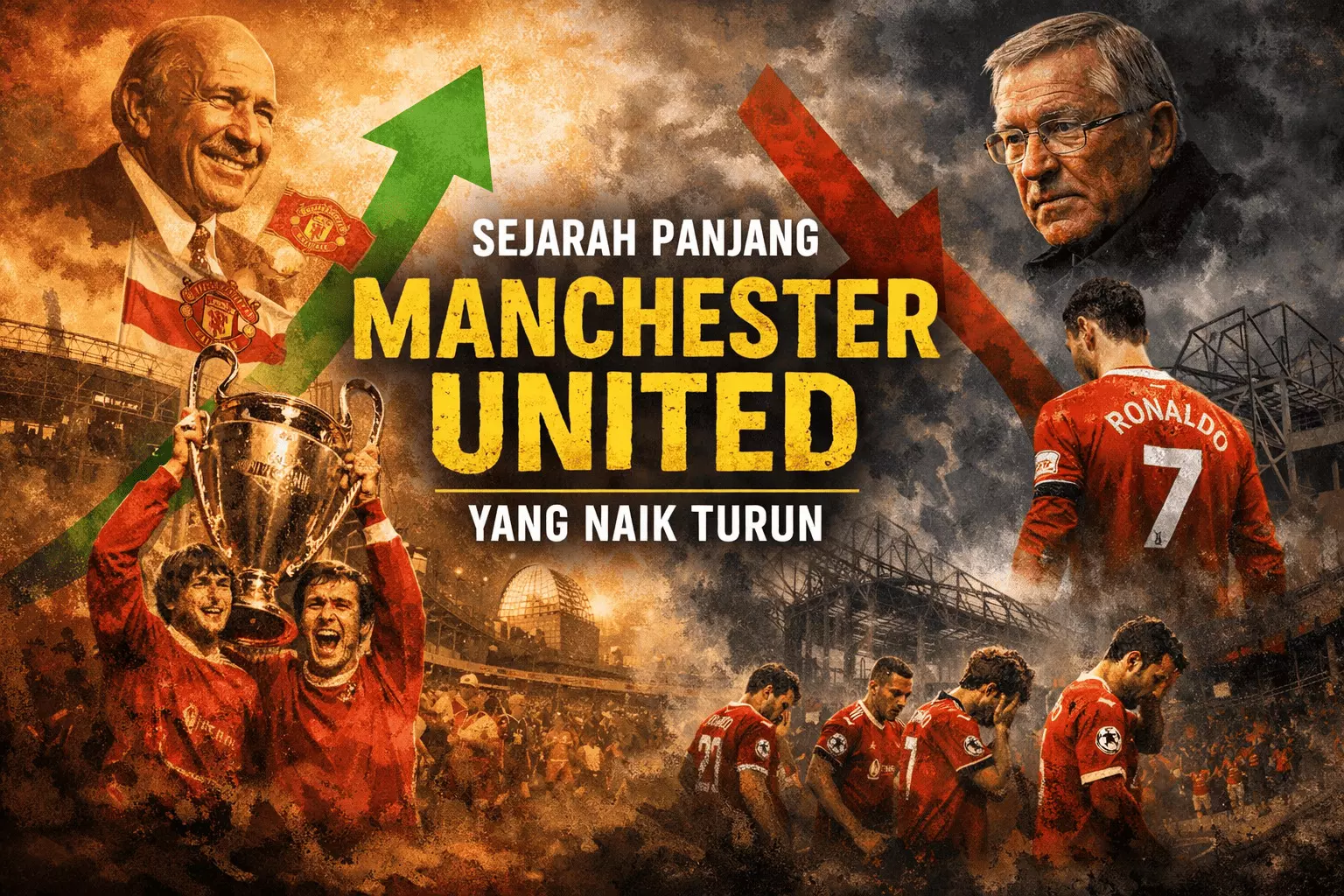 Sejarah panjang Manchester United yang naik turun sejak pendiriannya pada 1878, era kejayaan, hingga tantangan modern seperti isu manajemen, dan performa klub.