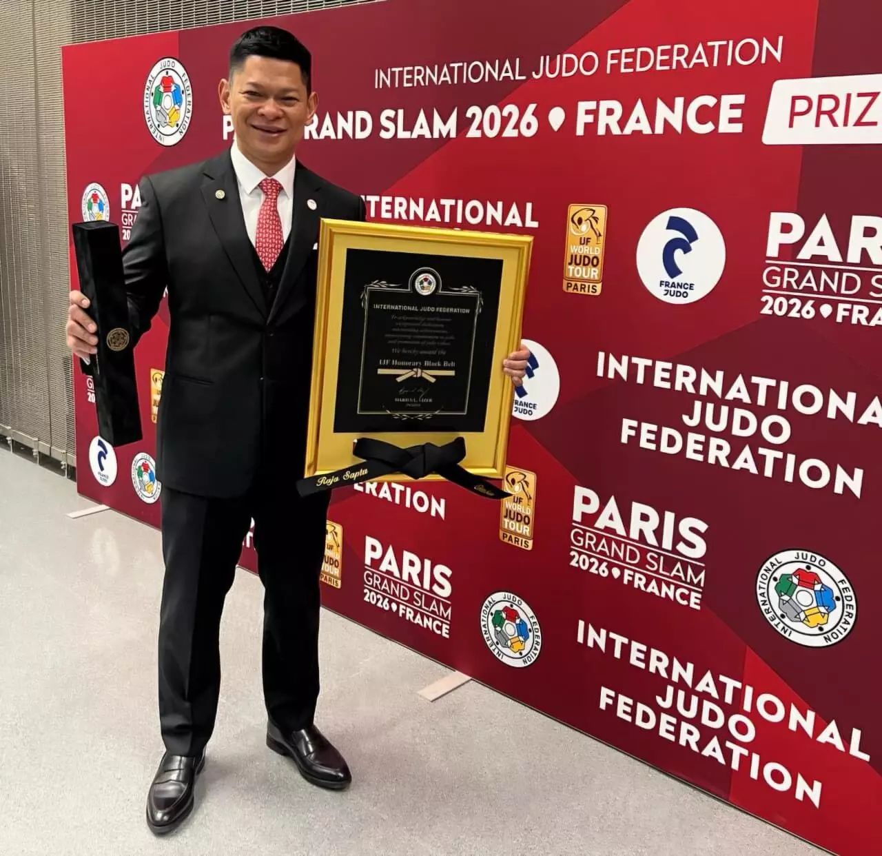Presiden IJF Marius Vizer secara resmi menganugerahkan Black Belt atau Sabuk Hitam Kehormatan serta Diamond Pin kepada Ketua Umum NOC Indonesia Raja Sapta Oktohari dalam acara Judo Gala Paris Grand Slam 2026.