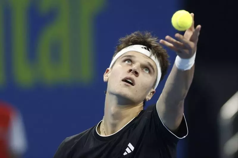 Petenis Ceko Jakub Mensik beraksi dalam pertandingan babak perempat final Qatar ExxonMobil Open melawan petenis Italia Jannik Sinner di Doha, Kamis (19/2/2026). (ATP)