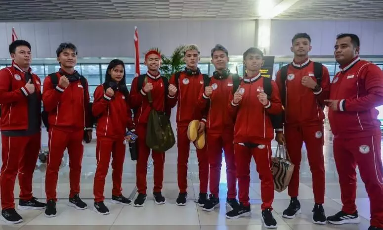 Para atlet dan ofisial PB Pertacami (Persatuan Tarung Campuran Indonesia) yang akan mengikuti AMMA Youth Championship 2025, berpose di Bandara Soekarno-Hatta, Tangerang, Banten, Senin (26/8/2025). (ANTARA/HO/PB PERTACAMI)
