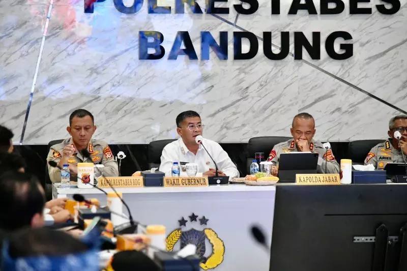 Wakil Gubernur Jawa Barat Erwan Setiawan bersama Kapolda Jabar Irjen Pol Rudi Setiawan, Kapolrestabes Bandung Kombes Pol Budi Sartono dan Dandim 0618 Kota Bandung Kolonel Inf Mohamad Iswan Nusi dalam Rakor Pengamanan laga Persib Bandung vs Persija Jakarta di Bandung, Kamis (8/1/2025). (ANTARA/HO Pemprov Jabar)