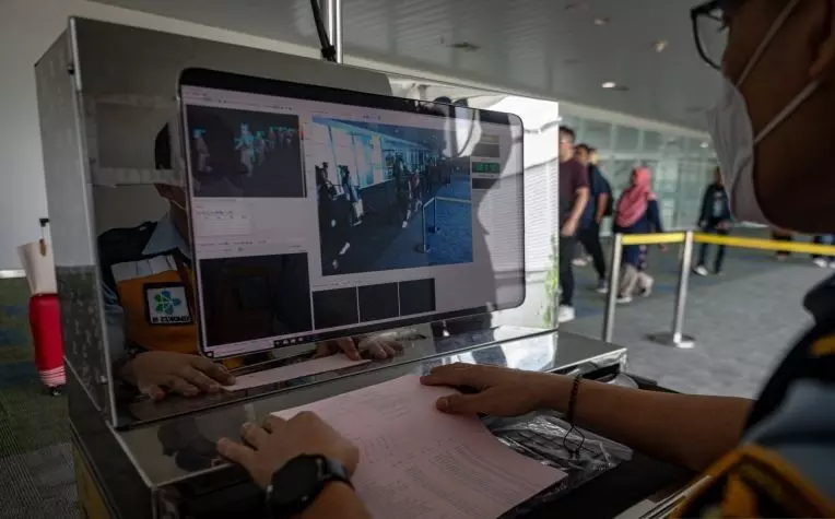 Petugas memantau layar yang menunjukkan suhu tubuh penumpang asal Malaysia saat melalui alat pemindai suhu tubuh digital di Bandara Jenderal Ahmad Yani, Semarang, Jawa Tengah, Kamis (05/2/2026), dalam upaya pengawasan terhadap pelaku perjalanan udara dari luar negeri guna mencegah penularan virus Nipah di Indonesia. (ANTARA FOTO/Aji Styawan/foc)