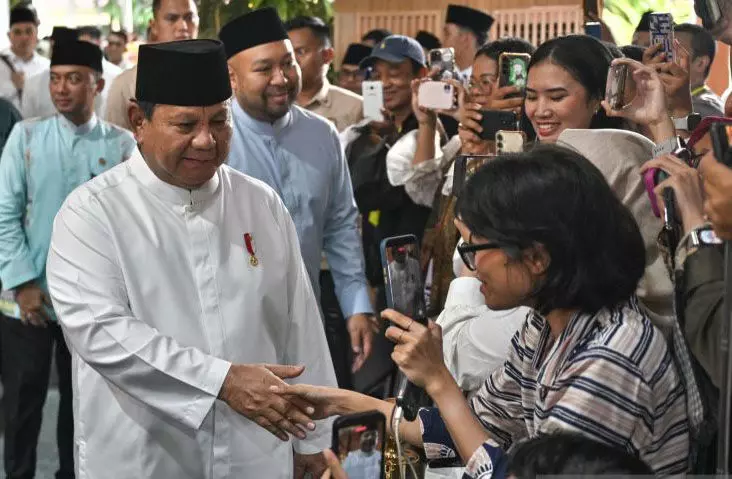 Presiden Prabowo Subianto (kedua kiri) bersama putranya, Didit Hediprasetyo (ketiga kiri) dan Mensesneg Prasetyo Hadi (kiri) menyapa warga dalam halalbihalal Hari Raya Idul Fitri 1447 Hijriah di kompleks Istana Kepresidenan, Jakarta, Sabtu (21/3/2026). ANTARA FOTO/Bayu Pratama S/app/rwa.
