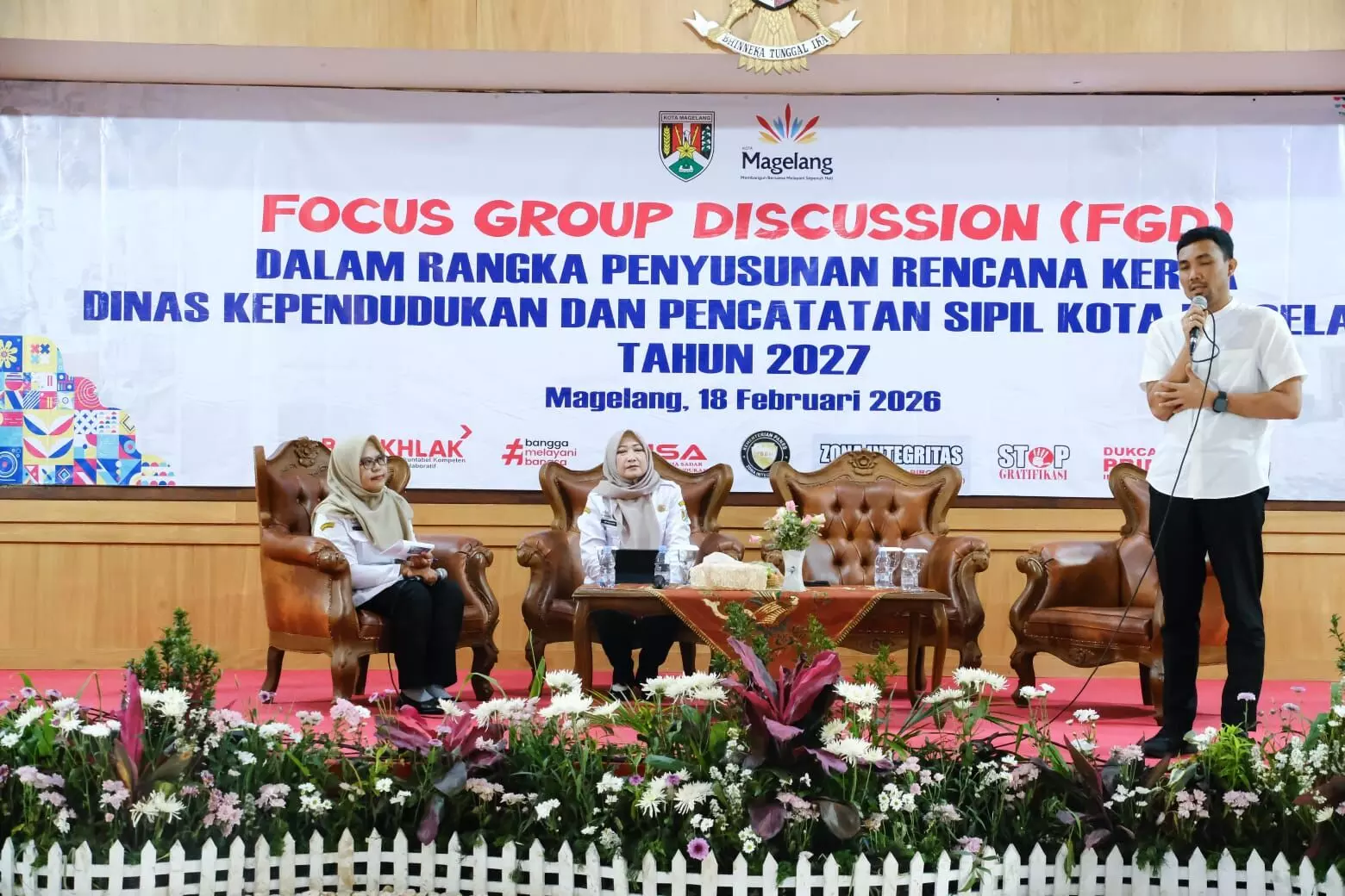Dinas Kependudukan dan Pencatatan Sipil Kota Magelang (Disdukcapil) menggelar Focus Group Discussion (FGD) penyusunan Rencana Kerja Tahun 2027, di Aula Adipura Kencana, Rabu (18/2/2026).