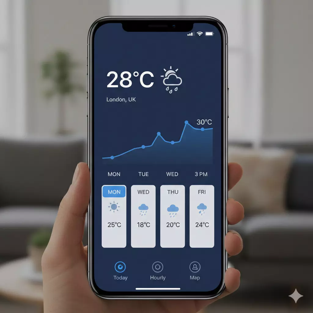 Setelah lokasi dipilih, aplikasi akan menampilkan prakiraan cuaca per jam, harian, atau beberapa hari ke depan, termasuk suhu, kemungkinan hujan, serta kondisi cuaca seperti cerah, berawan, hujan atau badai.
