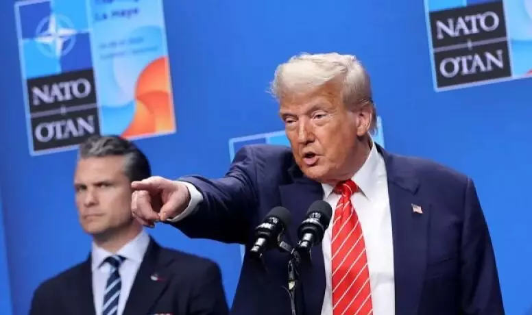 Ilustrasi: Presiden AS Donald Trump (depan) menghadiri konferensi pers setelah KTT NATO di Den Haag, Belanda, pada 25 Juni 2025. (ANTARA/HO- Xinhua/Zhao Dingzhe/pri.)