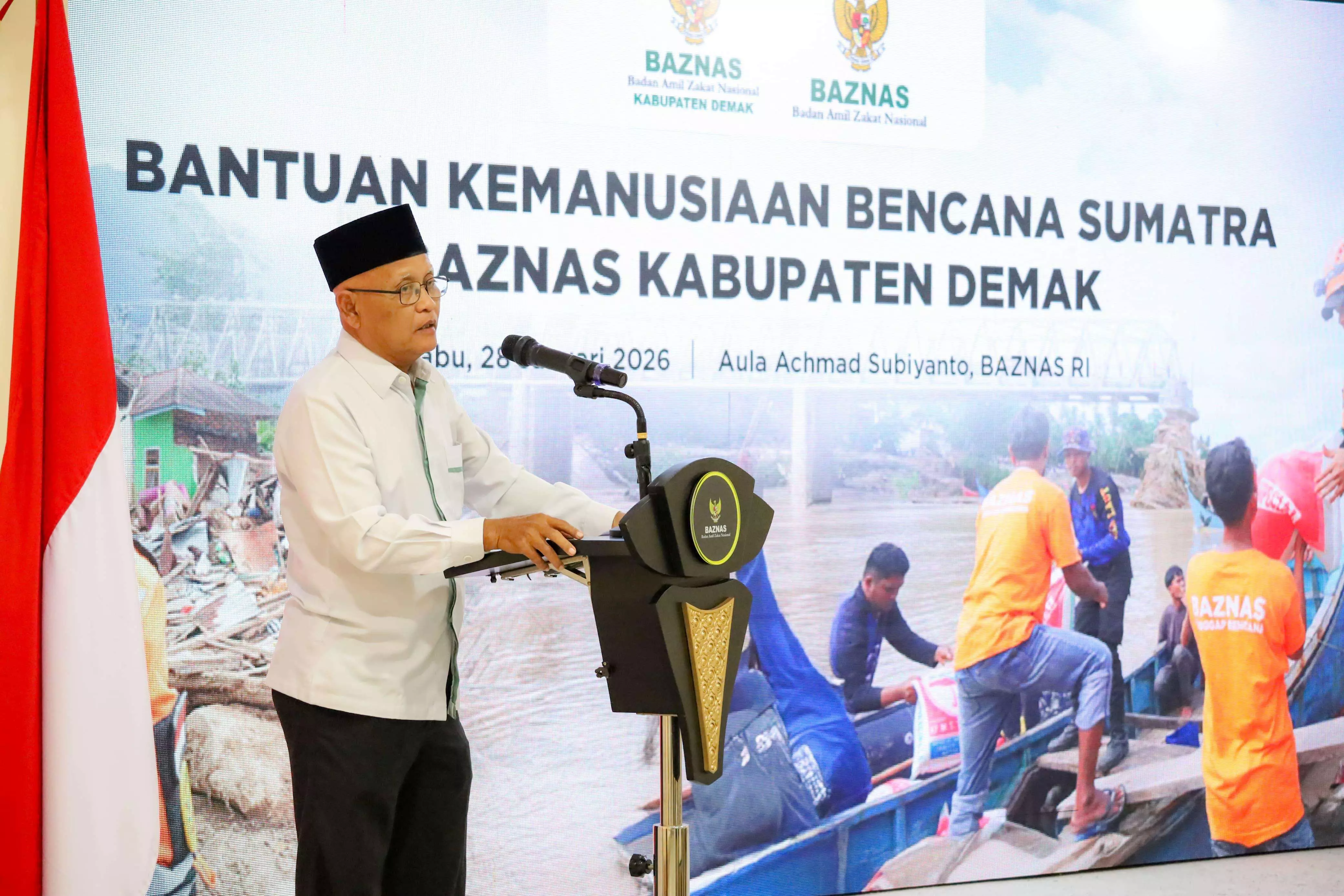 Penyerahan bantuan kemanusiaan tersebut diselenggarakan di Gedung BAZNAS RI, Jakarta, Rabu (28/1/2026). Hadir Pimpinan BAZNAS RI Bidang Pengumpulan Dr. H. Rizaludin Kurniawan M.Si. yang diwakili oleh Direktur Pengumpulan Perorangan BAZNAS RI, Fitriansyah Agus Setiawan, Ketua BAZNAS Kabupaten Demak, H. Bambang Soesetiarto, SIP, beserta jajaran.