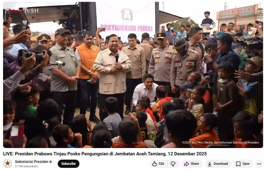 Presiden Prabowo Subianto meninjau posko pengungsian korban banjir di kawasan Jembatan Aceh Tamiang, Jumat (12/12/2025), untuk memastikan proses penanganan dan pemulihan berjalan optimal.