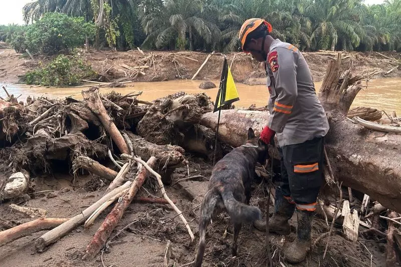 Satuan K-9 Unit SAR Ditpolsatwa Korps Sabhara Baharkam Polri membantu proses pencarian korban bencana alam di bantaran Sungai Desa Huta Raja, Kecamatan Batang Toru, Tapanuli Selatan, Sumatera Utara (Sumut), pada Selasa (2/12).