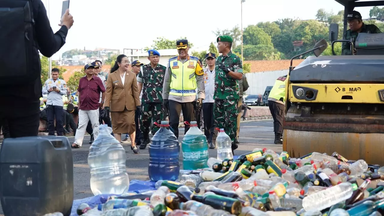 Polrestabes Semarang memusnahkan ribuan botol minuman keras (miras) hasil sitaan dari Operasi Pekat Candi 2026. Pemusnahan dilakukan secara simbolis menggunakan alat berat usai pelaksanaan Apel Gelar Pasukan Operasi Ketupat Candi 2026 di halaman Mapolrestabes Semarang.
