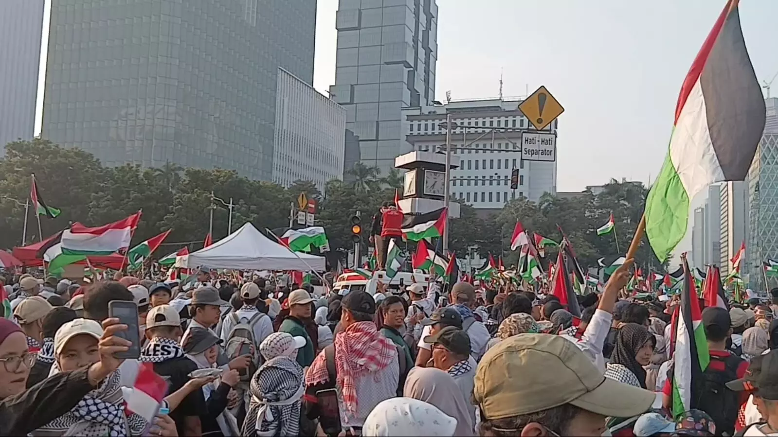 “Ada sekitar 250 bus dari berbagai daerah yang datang ke Jakarta. Ini bukti bahwa kepedulian terhadap Palestina menyatukan banyak kalangan,” ujar Syauki di sela-sela aksi di depan Monas.